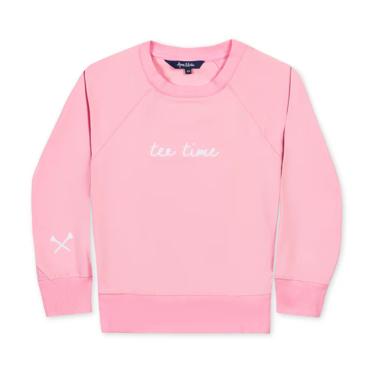 Designed in a dreamy french terry fabric, this classic crewneck features embroidery in delicate script across the front and a subtle crossed-club detail on the sleeve for a sweet, sporty touch. The soft fabric and ribbed cuffs and hem keep it comfortable and flattering, whether you’re heading to the course or lounging after your round.