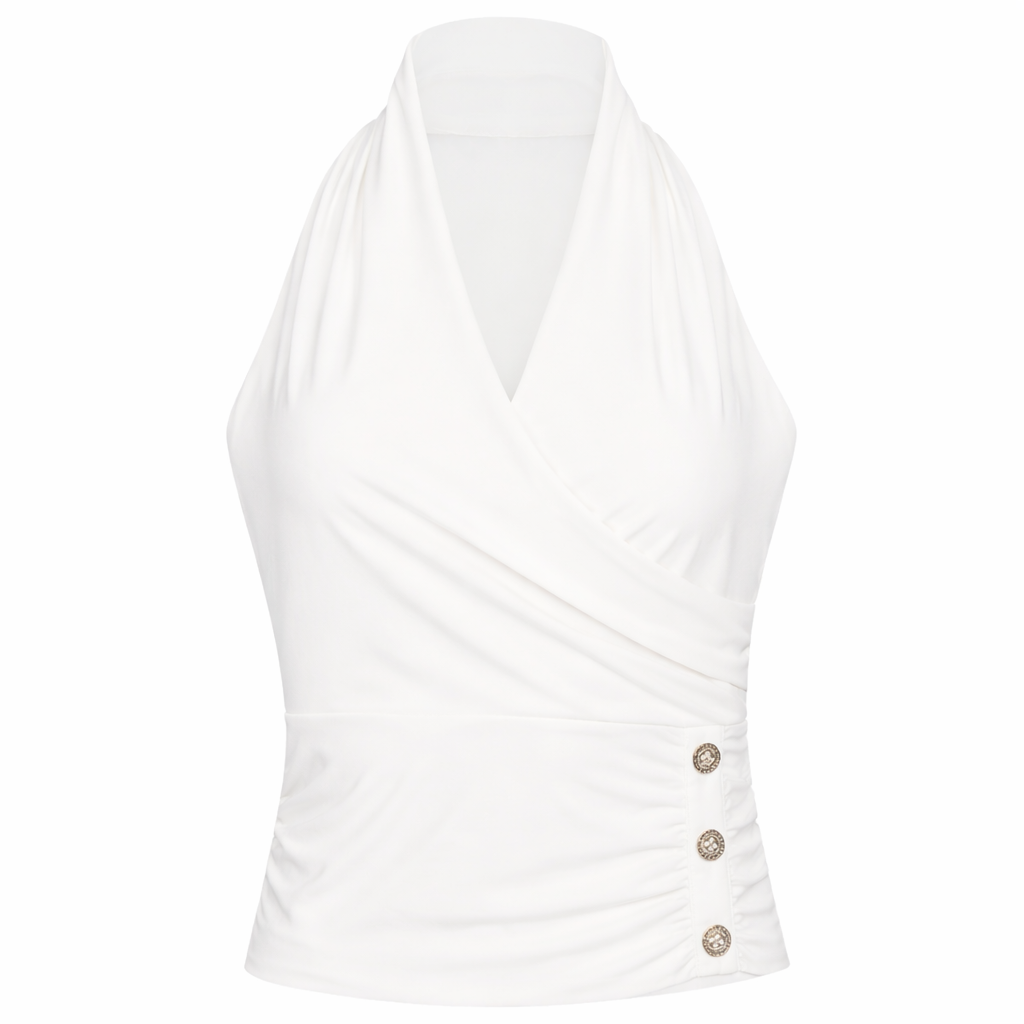 Sleek. Elevated. Unexpected. This is the top that redefines what a golf polo can be. It brings a sense of ease and sophistication with a silhouette that feels styled the moment you put it on. Made for women who want something a little different. A softly wrapped front creates a flattering, sculpted shape, while signature button detailing adds a refined edge. The mock neckline and T-back design keep the look modern, clean, and athletic.
