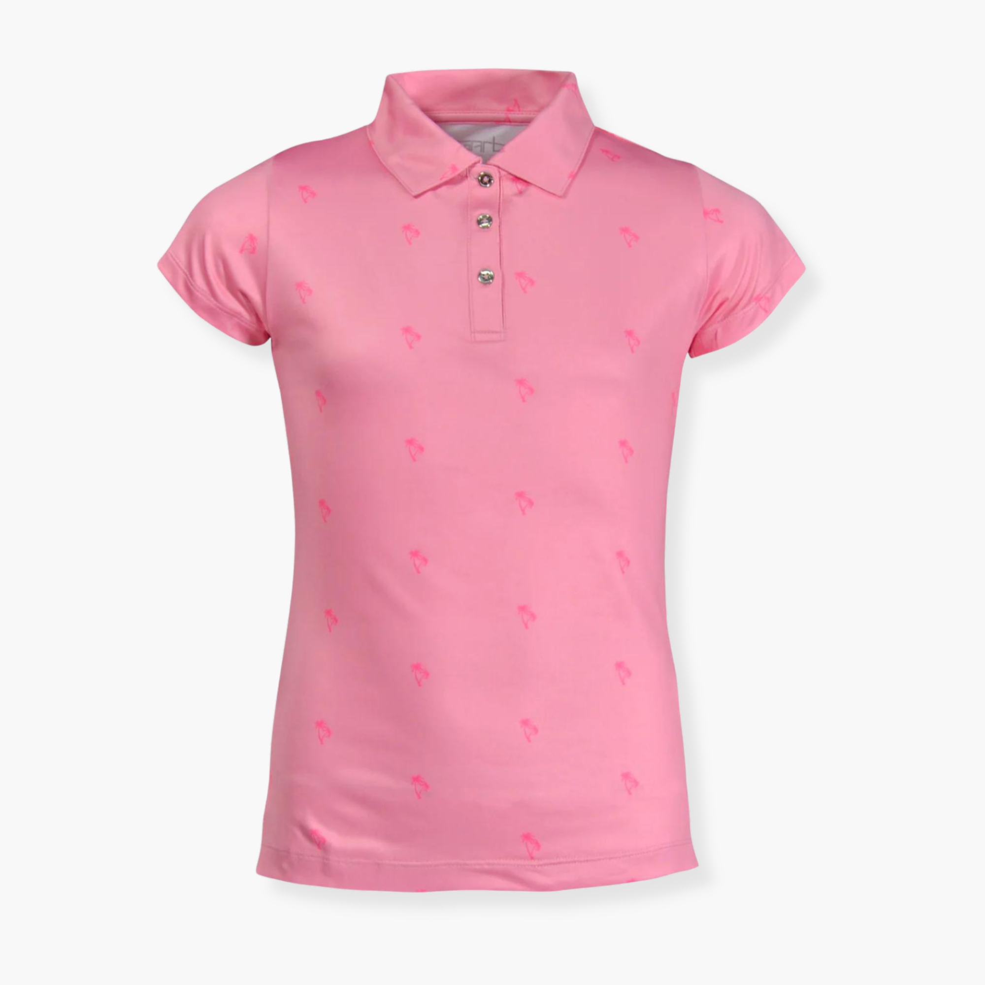 Part of the Garb Harbour collection, the Lilibet is a short sleeve girls golf polo in pink with hot pink palm tree print. Made with a moisture wicking spandex and poly blend guaranteed to keep her cool and comfortable. The 3-button placket adds a touch of sophistication, making this polo versatile enough for any occasion. Whether it's on the green under the hot sun, or layered under a sweater, your girl will be dressed to impress.