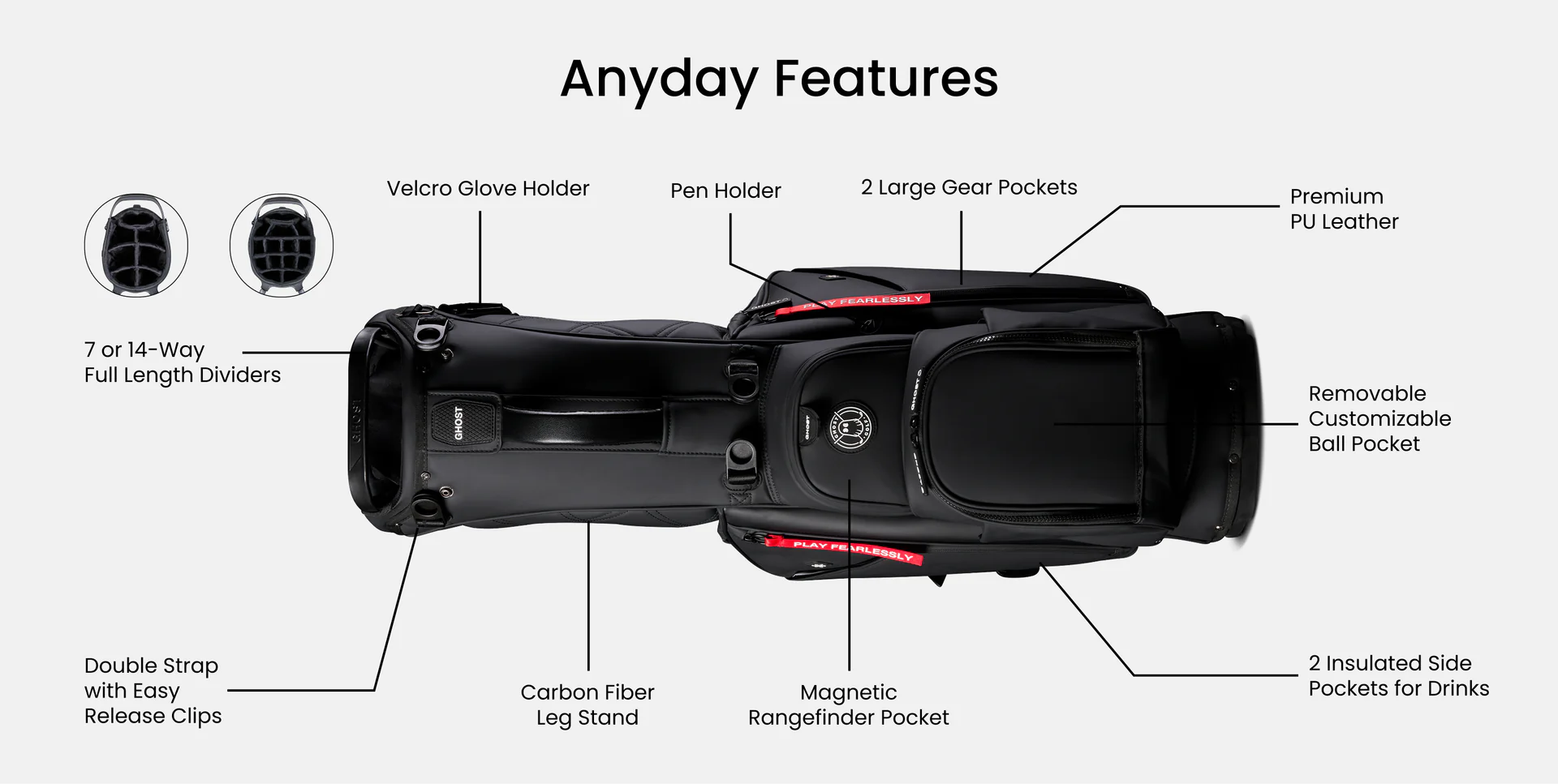 The Saya features a 4-way top with full-length dividers to keep clubs protected and organized, along with multiple pockets for essentials, valuables, and beverages. Weighing just a few pounds, it’s easy to carry by hand or shoulder strap. Finished with signature Ghost detailing and minimalist lines, the Anyday Saya redefines everyday performance with modern sophistication.