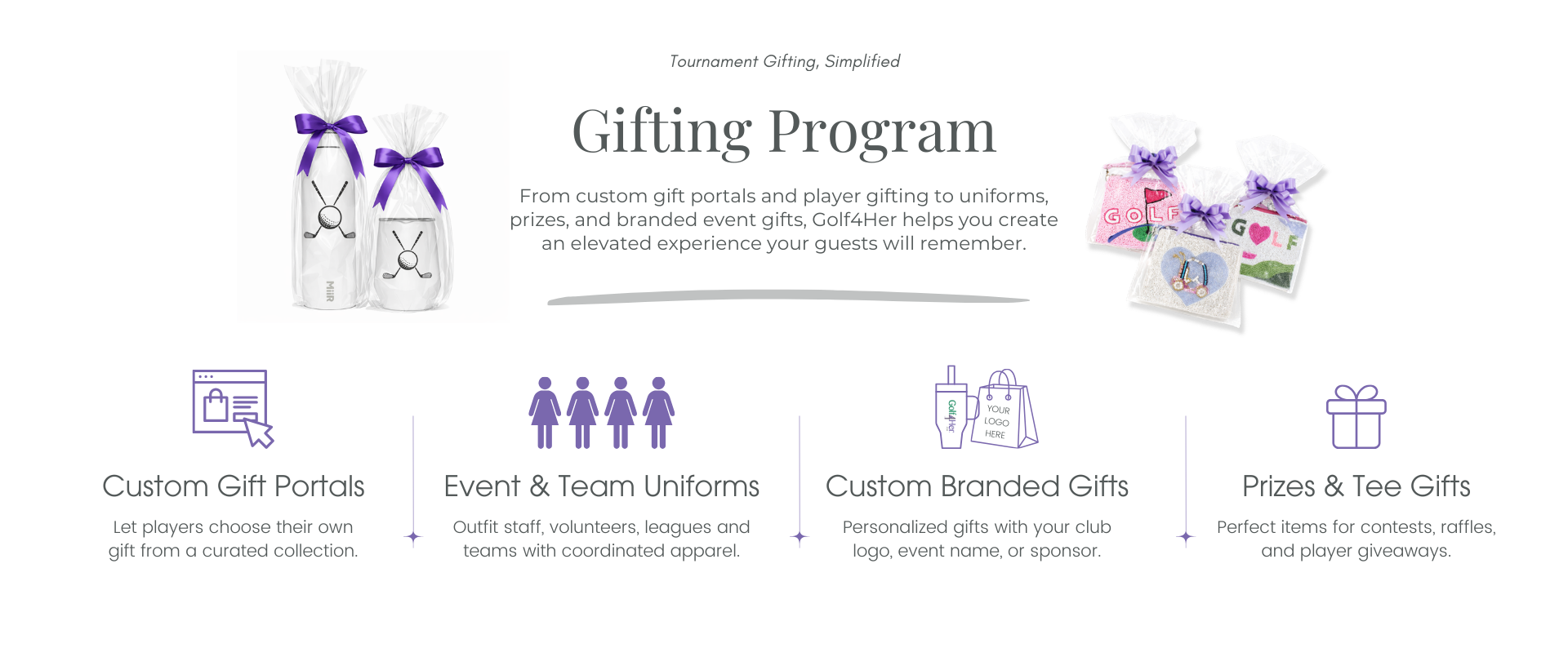 From custom gift portals and event uniforms to personalized gifts and prizes, Golf4Her helps you create a thoughtful and memorable experience for your players.
