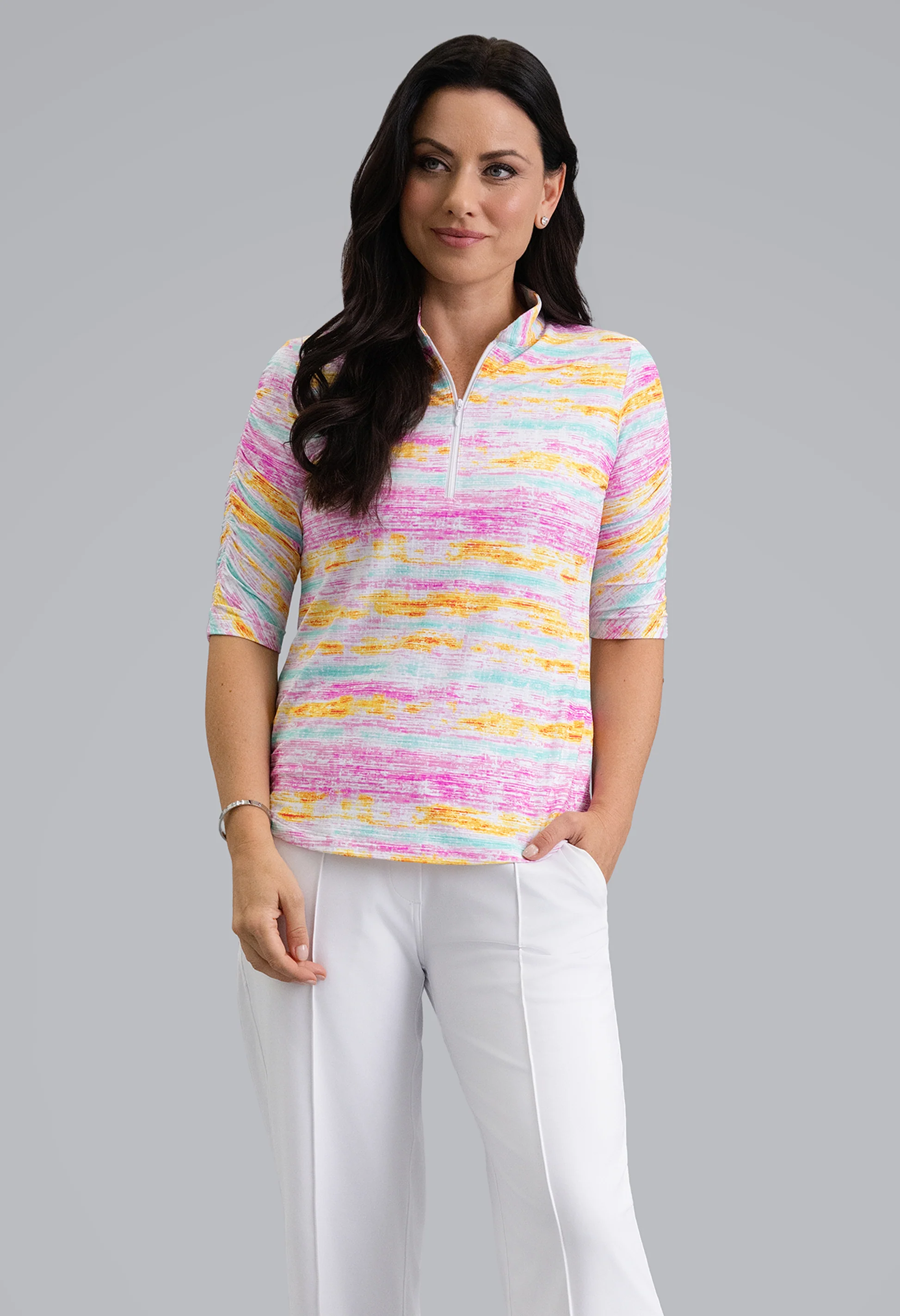 Sunlit mornings on the course feel effortless in this printed mandarin collar top. The subtle texture and artful ruching bring a quiet sophistication that carries from warm-ups to lunch with ease. It’s light on the body and easy in spirit. Crafted with cooling IceFil fabric, this top keeps skin comfortable and dry when the sun is out. UPF 50+ helps protect you on long drives and walks, while moisture wicking and antimicrobial performance keep the feeling fresh all day.