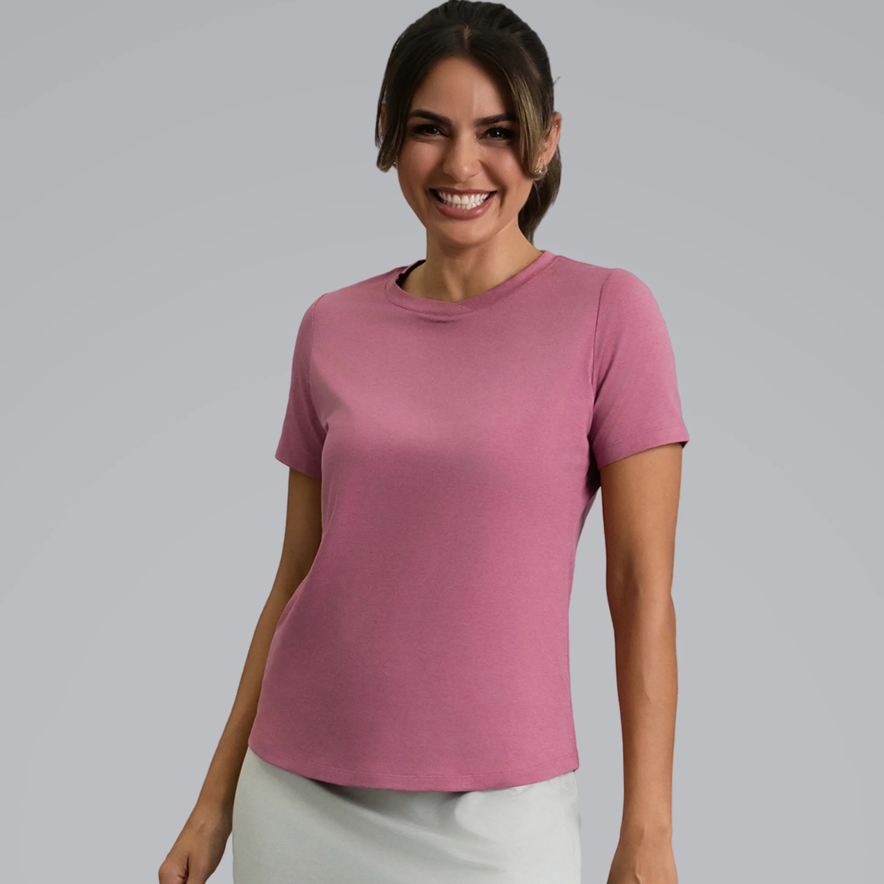 A go to everyday tee that feels soft and moves with you. Heathered knit and a relaxed silhouette make this short sleeve perfect for warm weather golf, travel, errands, or just hanging out with your favorite skort or jogger