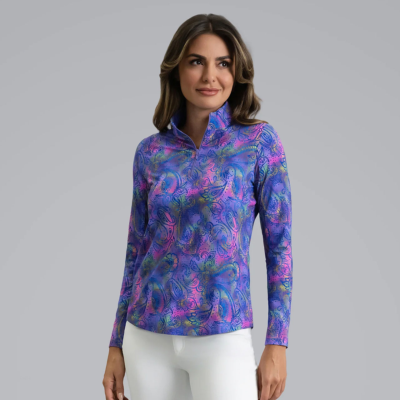 The IBKUL Shannon top gives you more than just a pretty pattern — it gives you confidence. The swirling paisley print stands out on the course and feels feminine yet athletic. IceFil® cooling and breathable mesh mean you stay comfortable even on hot, sunny days. Add in UPF 50+ protection and moisture-wicking performance, and you’ve got a top that’s as practical as it is stylish, letting you focus on your swing while looking polished.