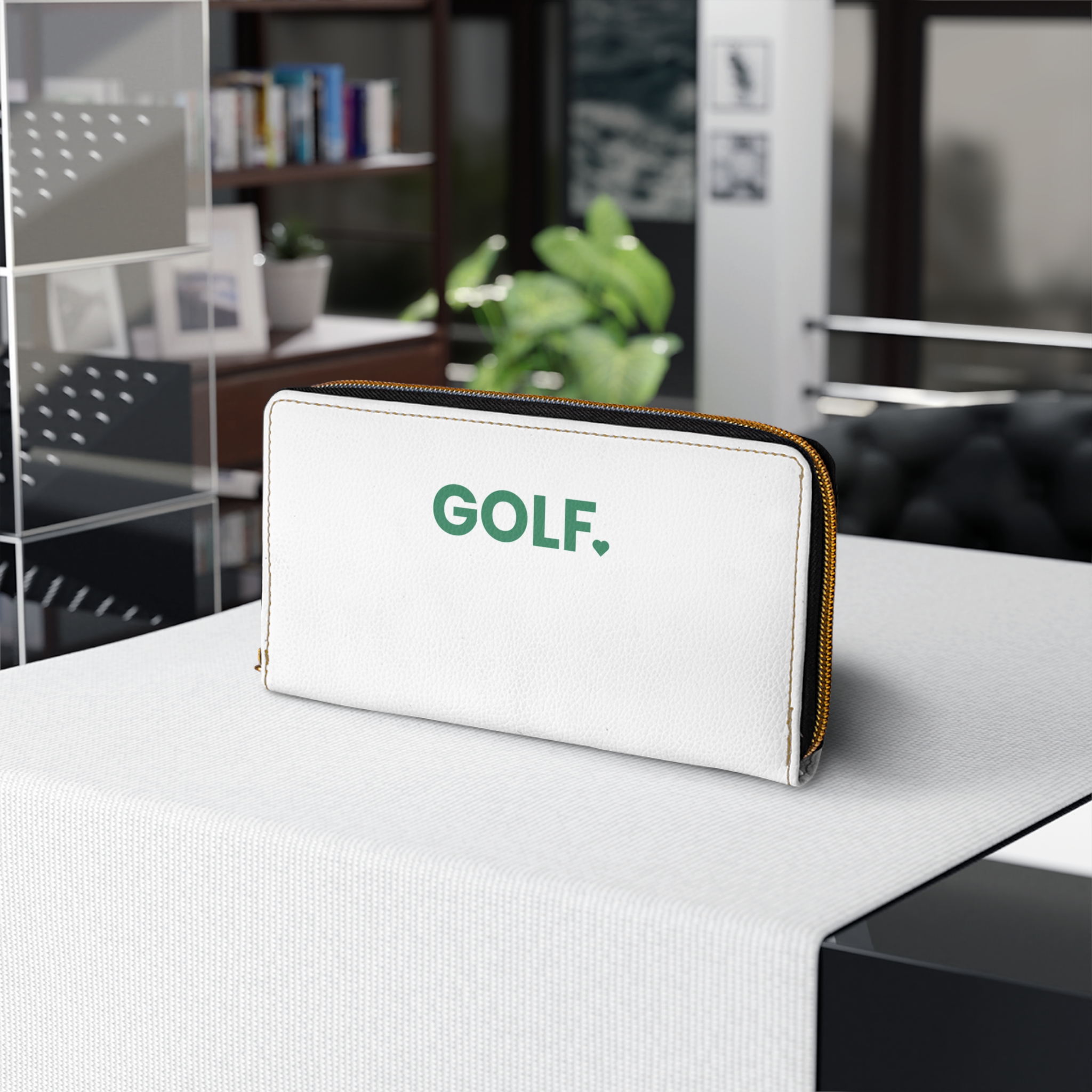 A sleek zip-around wallet crafted in luxurious PU leather with crisp, vibrant printing and gold-accent details. The smooth exterior shows a minimalist “GOLF” mark, giving a subtle nod to the green and fairways without shouting. Inside, the layout keeps a golfer’s essentials organized: multiple card slots, a bill pocket, a coin compartment, and space for a slim checkbook. The durable nylon zipper and alloy hardware glide reliably, while gold-colored thread stitching frames the design for a refined, sporty finish. Carry it to the course, clubhouse, or everyday errands — it feels composed in hand and built to keep pace with an active life.