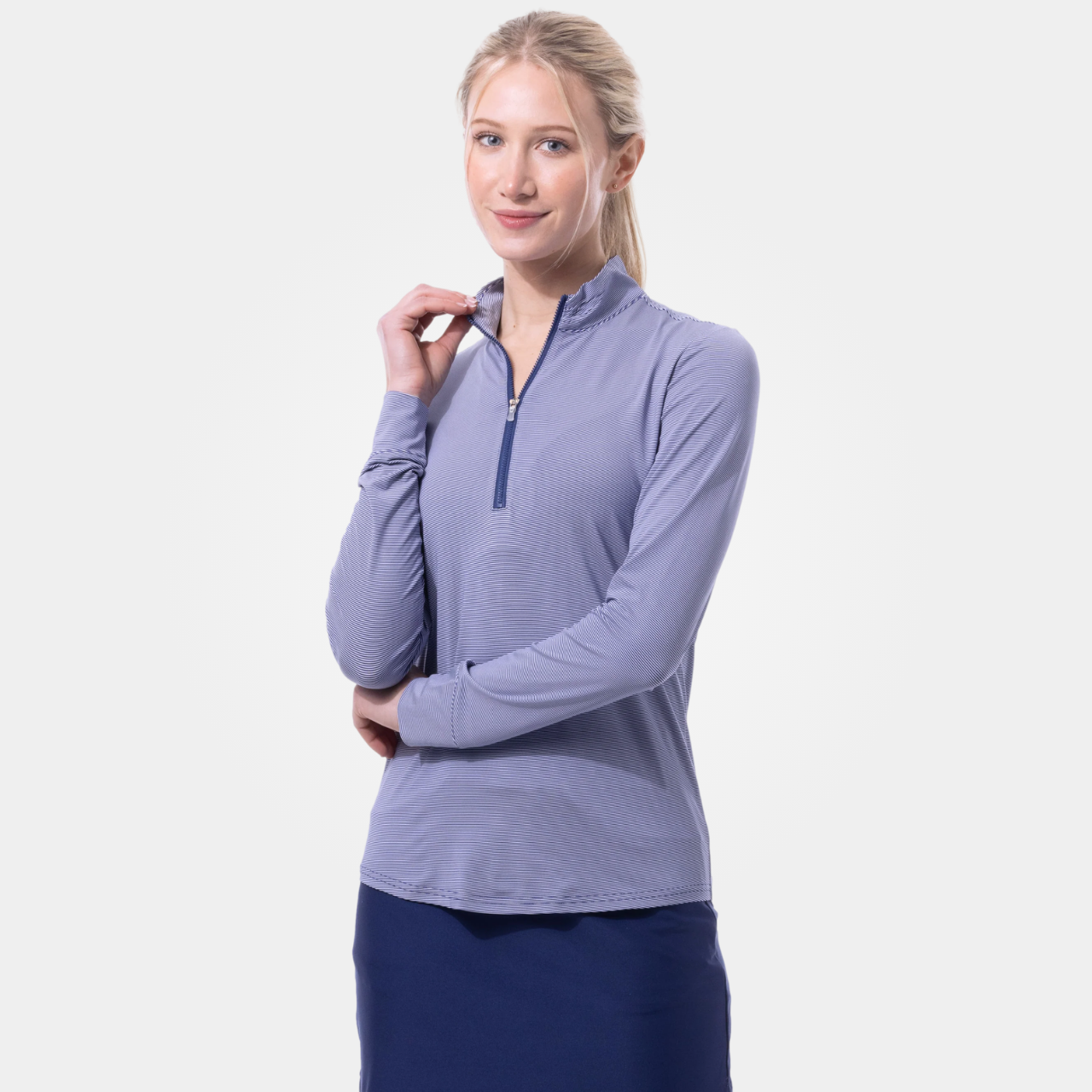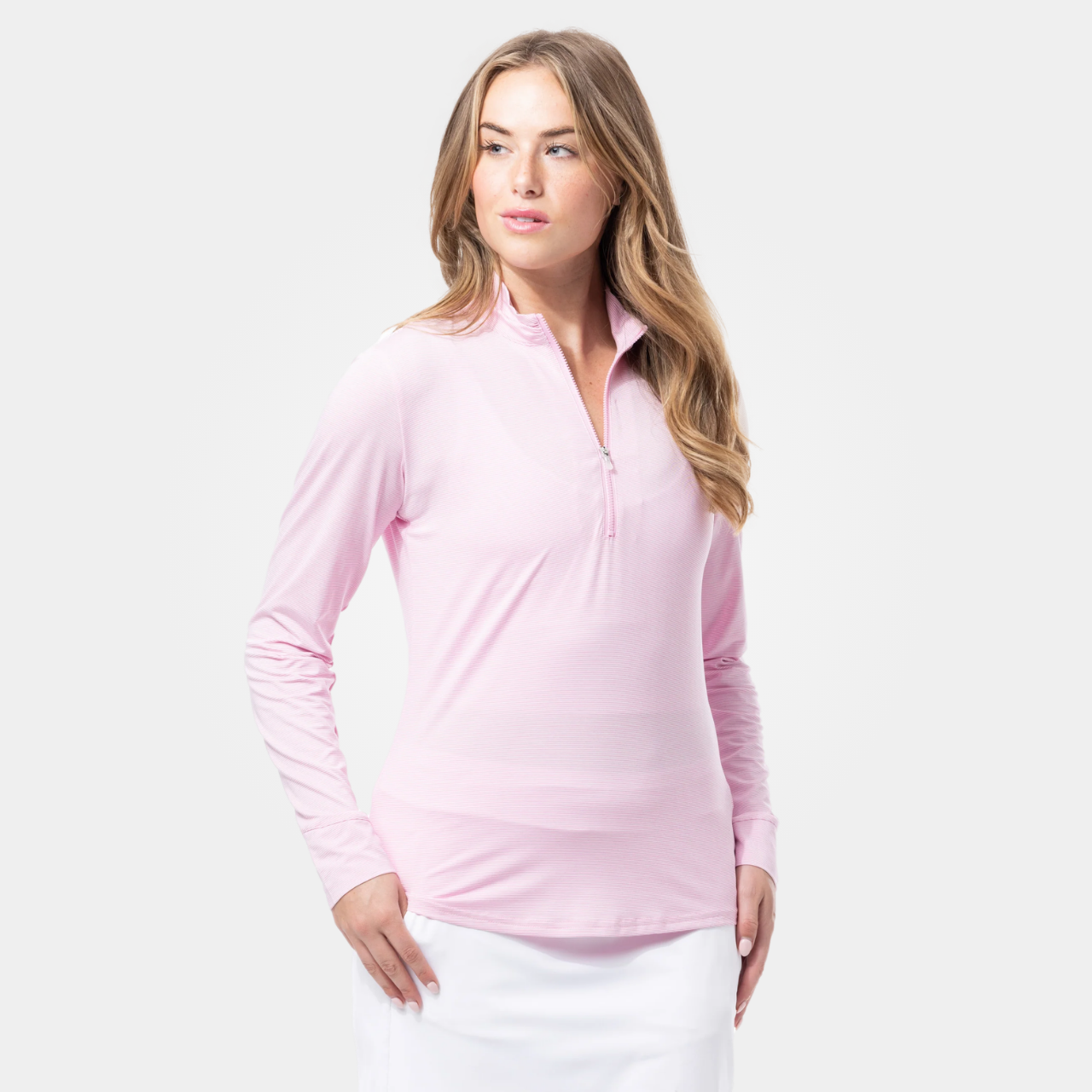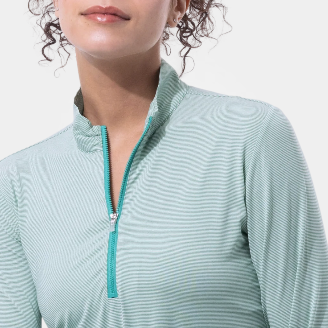 Clean, classic, and built for performance. This striped 1/4 zip mock delivers that effortless polished look while keeping you cool, covered, and comfortable through every round. Designed with SanSoleil’s signature SolMelange Ice fabric, it actively cools the body while offering lightweight breathability and stretch. The soft heathered stripe adds subtle texture, while the mock neckline and zip-front give you that elevated, sport-forward finish.