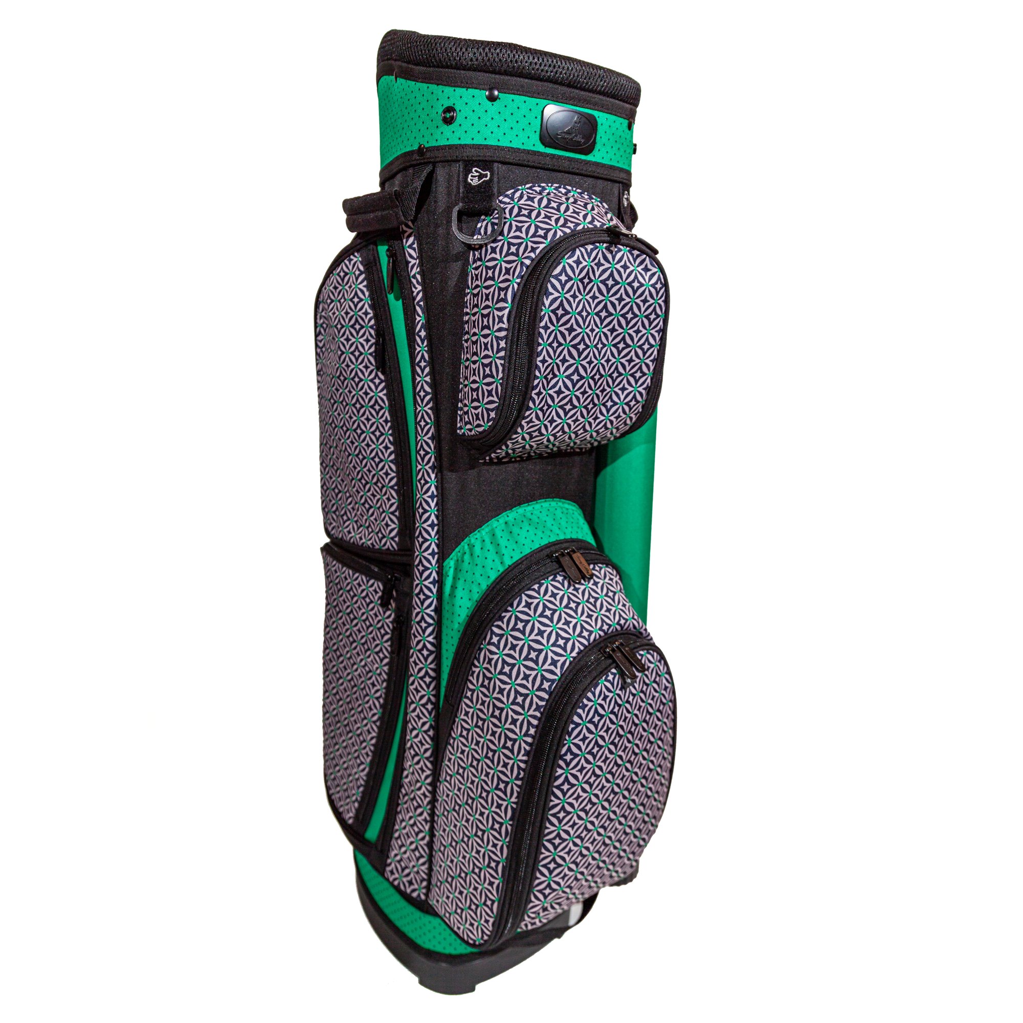 This lighter Sassy Caddy Dublin golf bag weighs only 3 pounds and is designed with 14 full-length dividers. The shoulder strap is located at the back of bag, allowing more pockets and features on front side of golf bag. Created with water-proof, fade-resistant, and stain-resistant fabrics.