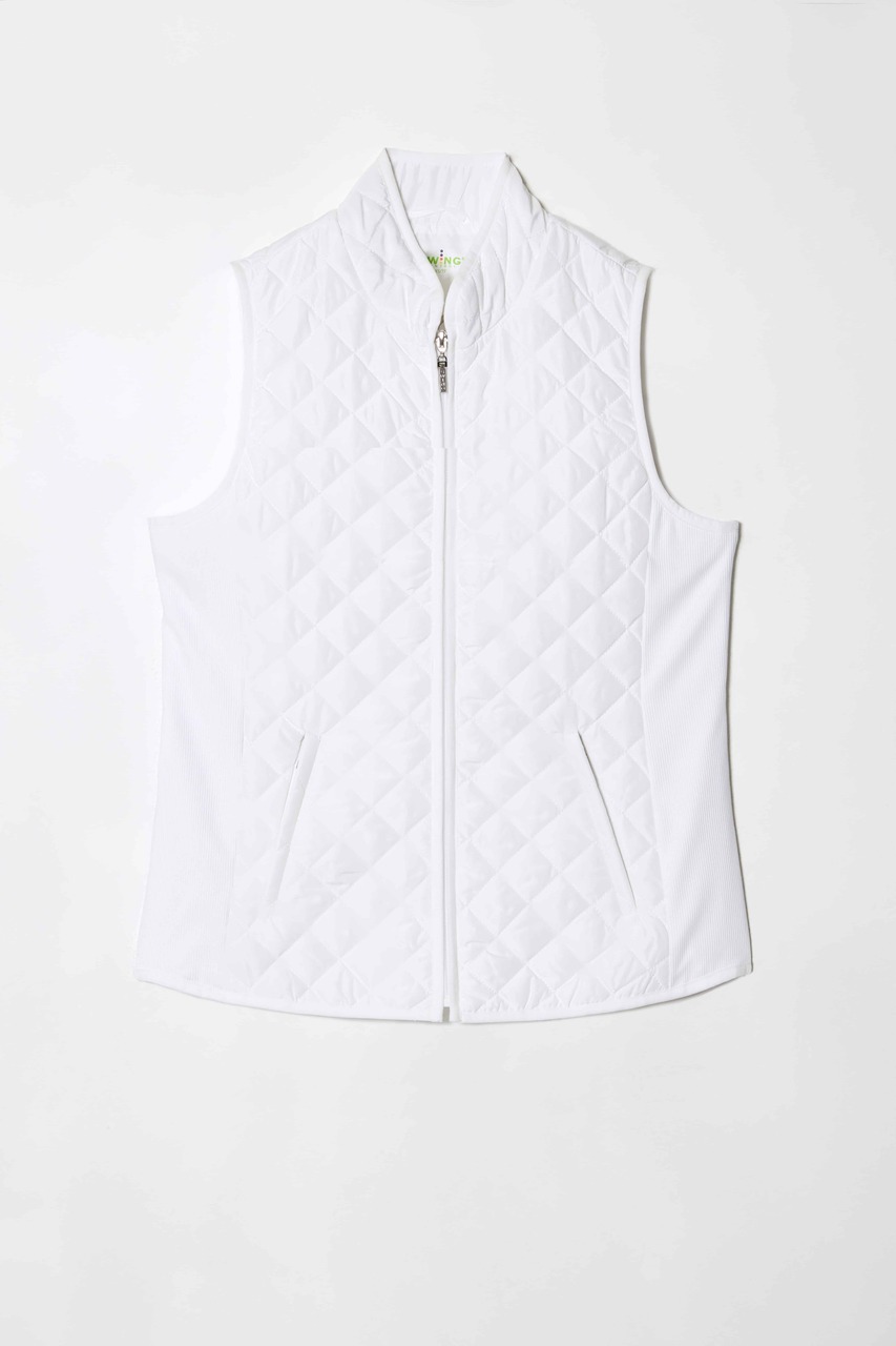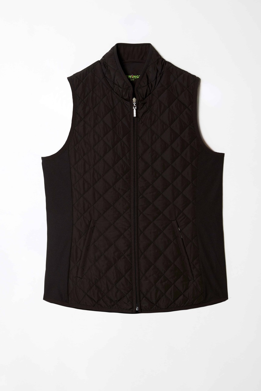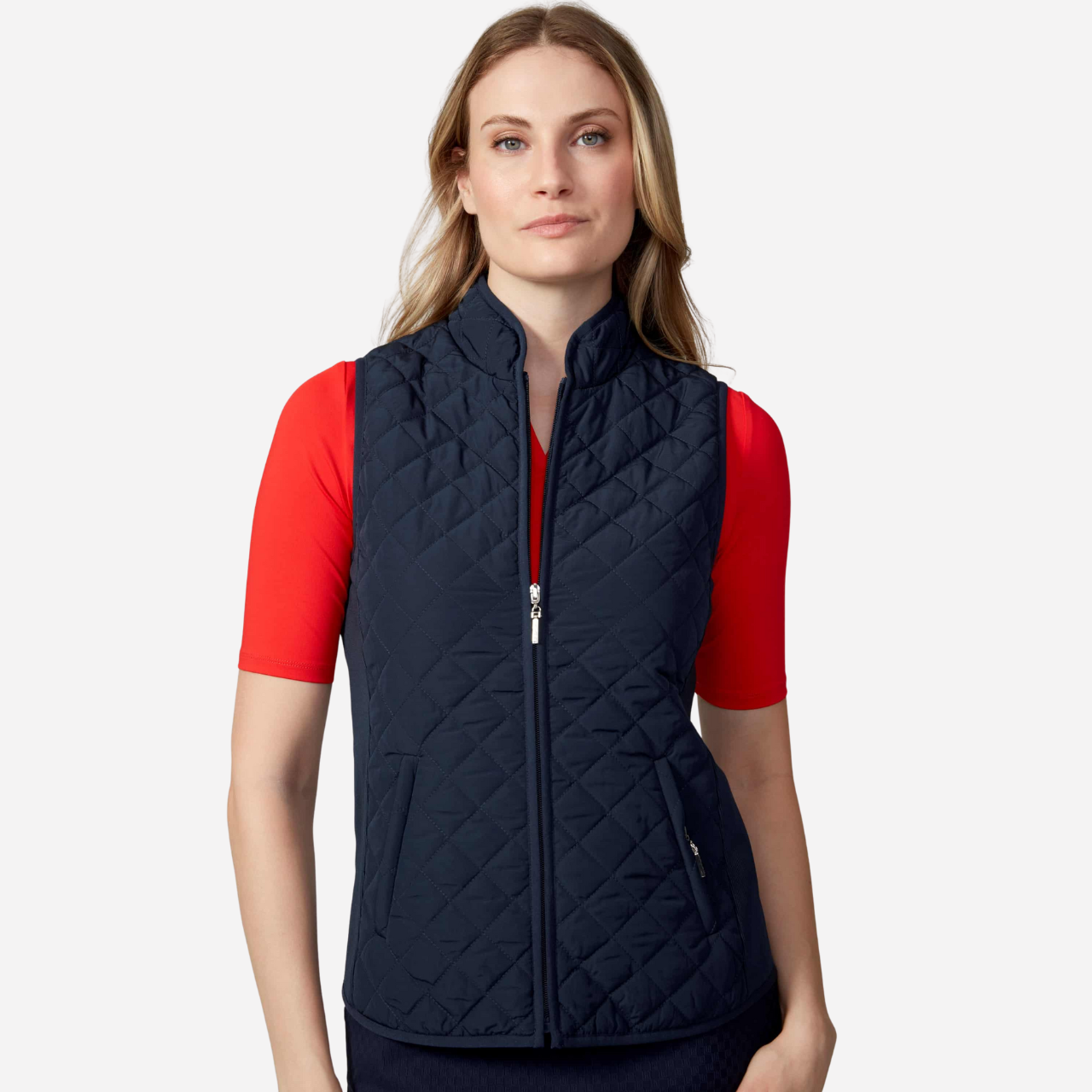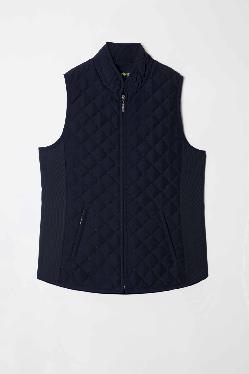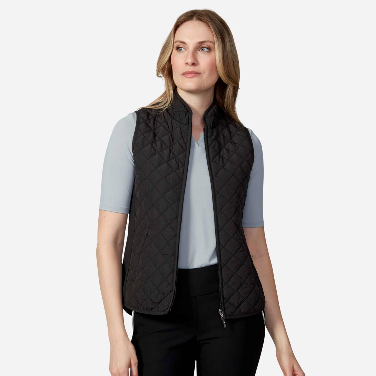 This vest is the perfect blend of cozy and polished. The quilted front/back adds warmth without bulk, while the ribbed detailing keeps the fit flattering and flexible. It layers easily over long sleeves or polos and gives any outfit a pulled-together finish, whether you’re on the course or out running around.