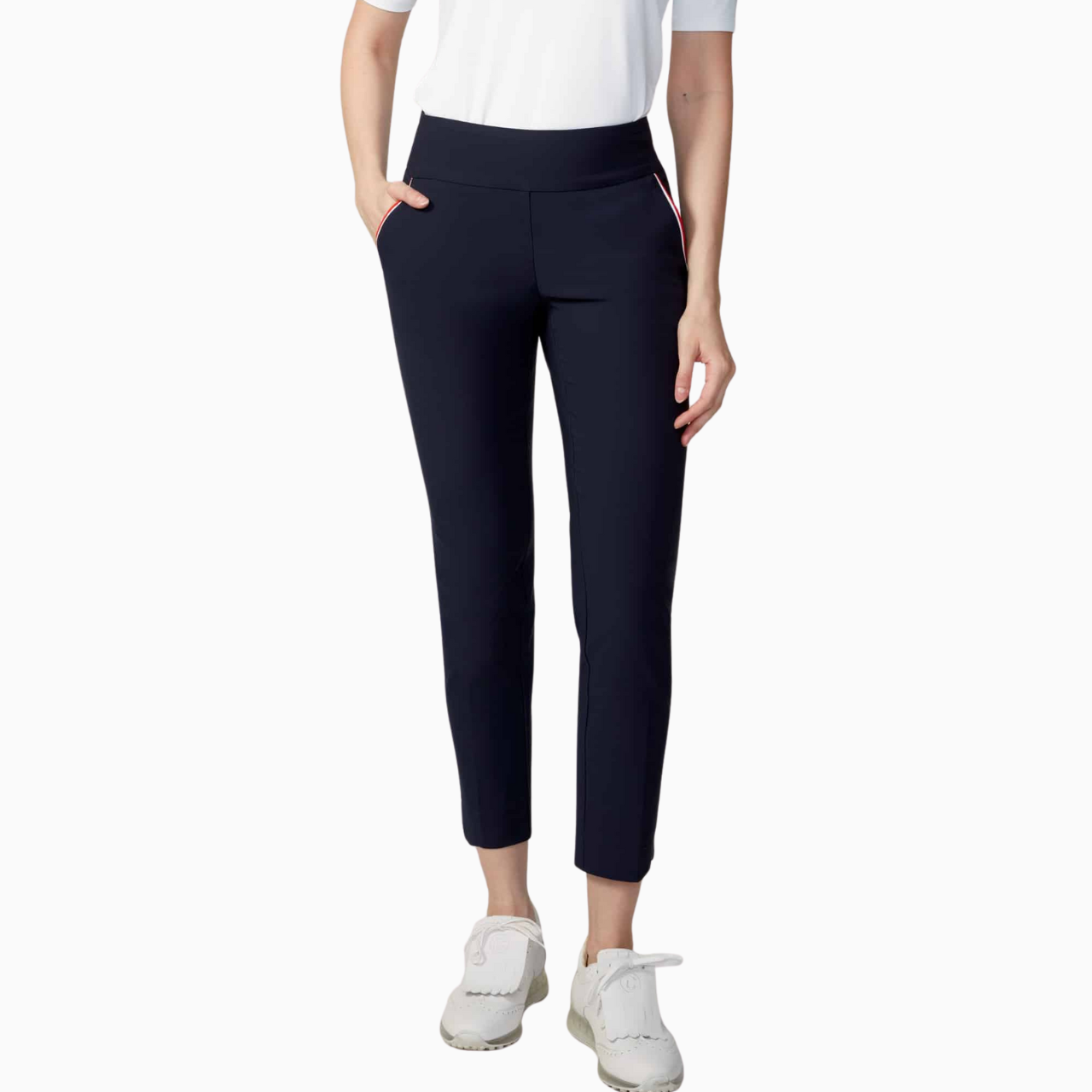 - Sporty stripe piping on pockets and back of waistband