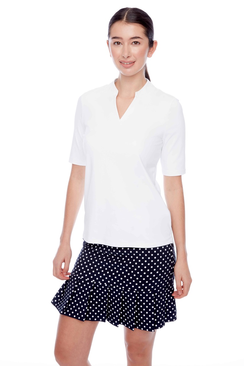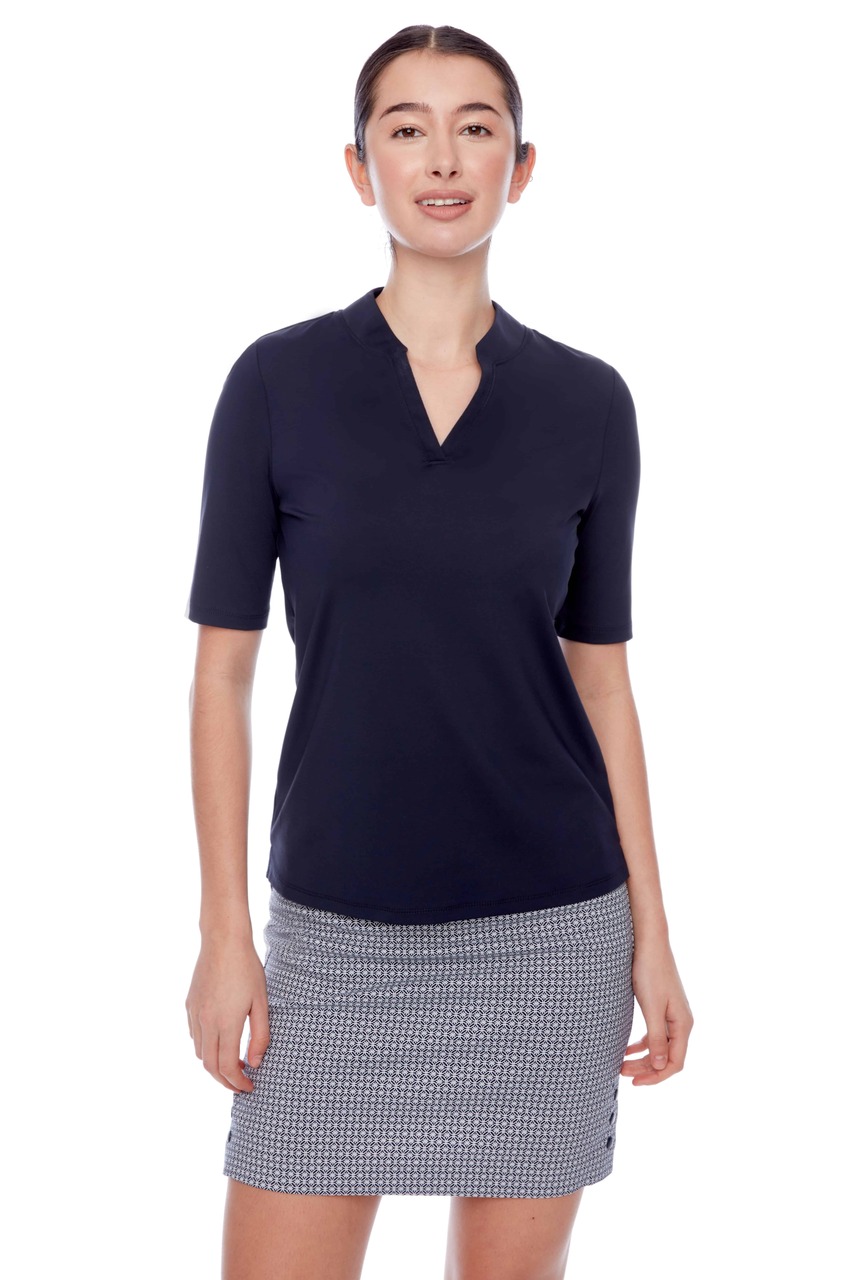 Sleek and streamlined, this minimal essential features an elegant open V-neck and a slim, flattering fit. Mid-length sleeves add a refined touch, making it an easy, versatile piece that transitions effortlessly from the course to the clubhouse.